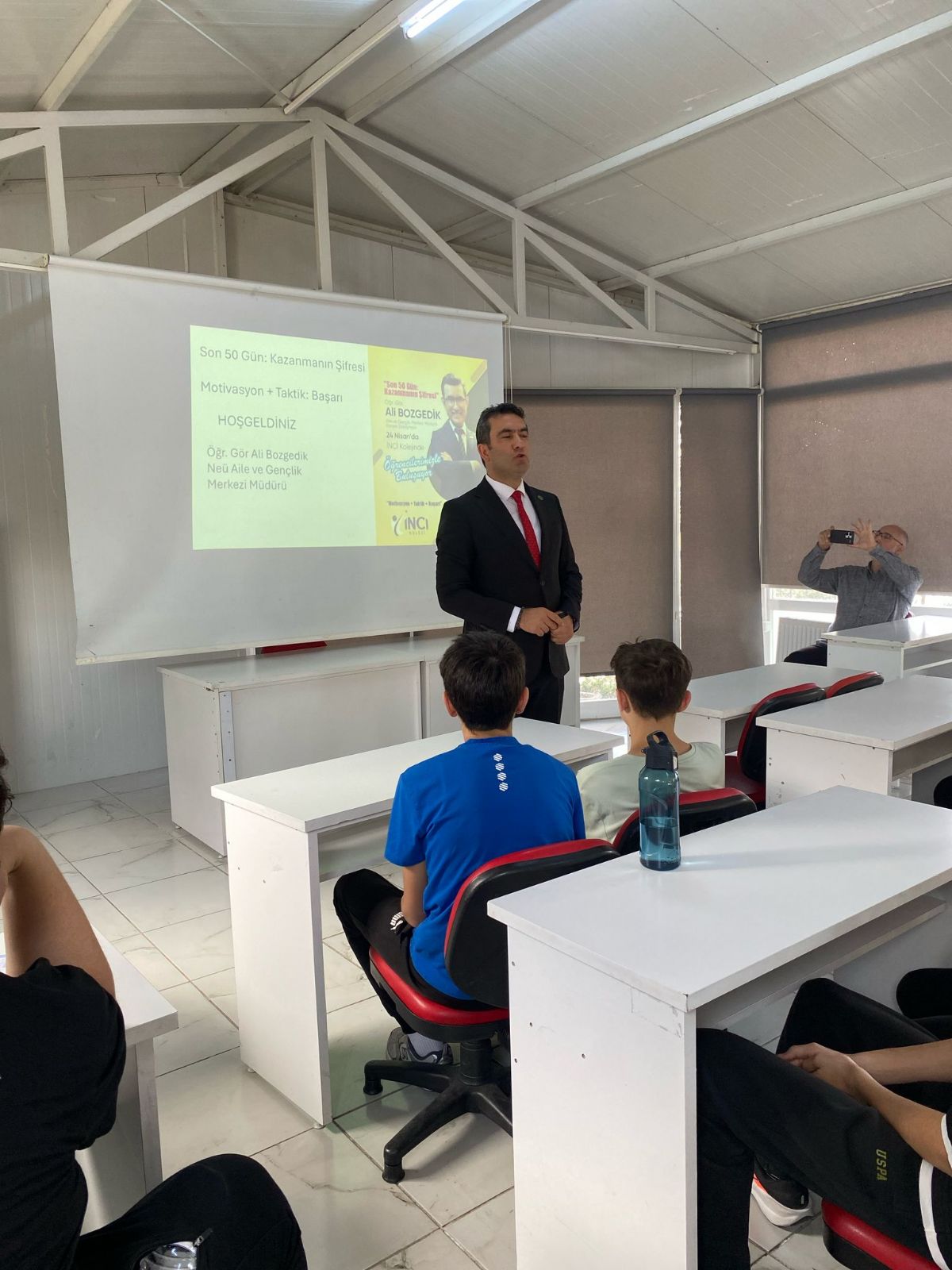Aile ve Gençlik Merkezi Müdürü Kariyer Danışmanı Öğr. Gör. Ali BOZGEDİK ile kolejimizde "Son 50 Gün: Kazanmanın Şifresi" programımızı tamamladık. Kendilerine engin bilgilerini öğrencilerimiz ile paylaştığı için teşekkür ederiz.